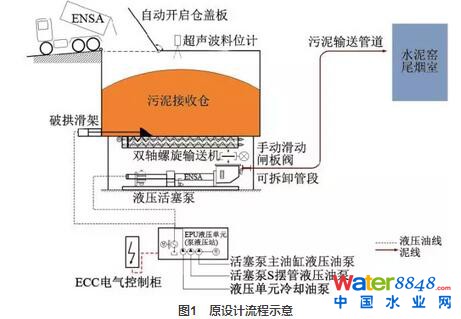 HZ公司原采用德國PM公司的技術(shù)產(chǎn)品,具體流程見圖1,城市生活污泥經(jīng)過汽車運輸至工廠后卸入污泥料倉,污泥在液壓破拱滑架的推送下經(jīng)過雙軸螺旋輸送機(jī)進(jìn)入液壓污泥泵,在污泥泵擠壓輸送作用下經(jīng)過污泥管道輸送至水泥窯尾煙室,進(jìn)入水泥窯內(nèi)焚燒。