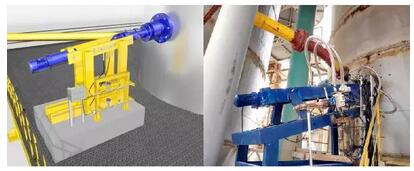 在本項目中污泥通過柱塞泵輸送至窯尾投加點,污泥在管道內(nèi)呈柱狀流形態(tài),根據(jù)柱塞泵換向速率不同,呈現(xiàn)為不同的脈沖柱狀流進(jìn)入窯尾煙室,污泥從管道內(nèi)沖出后會直接掉到煙室斜坡上,并裹挾著生料直接沖入回轉(zhuǎn)窯內(nèi),在窯內(nèi)吸熱后急劇膨脹、氣化、直至完全焚燒。