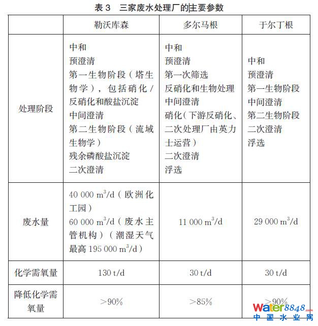 科倫塔公司(前身拜耳工業(yè)服務公司)由拜耳股份公司與朗盛集團合資組建,兩家公司分別占股60% 和40%?苽愃臼菤W洲化工園的管理者和經營者,該工業(yè)園由化工行業(yè)逾70 家公司組成,員工總數(shù)45 000 人,分布于勒沃庫森、多爾馬根和于爾丁根的三個園區(qū),并共同構成了德國最大的化工園區(qū)網。歐洲化工園園區(qū)的水和廢水管理工作由科倫塔公司負責?苽愃矩撠煿芾砣覐U水處理廠,工業(yè)廢水總量達80 000 m3/d。