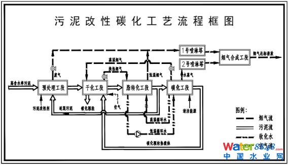該技術(shù)具有以下亮點(diǎn): (1)降低污泥含水量的技術(shù)創(chuàng)新 將污泥中的含水量從80%降到5%以內(nèi),通常是對污泥進(jìn)行高壓甩干脫水或外加熱源的辦法,其成本很高且有機(jī)物及重金屬無法分離。該項(xiàng)目運(yùn)用污泥改性碳化處理系統(tǒng)的方法,既可以實(shí)現(xiàn)余熱的充分回收利用,又能夠提高污泥的熱解特性和熱值品位。這樣便大大節(jié)約了能耗,降低了成本,當(dāng)污泥有機(jī)物含量達(dá)到50%以上即可實(shí)現(xiàn)能源的完全自給自足,無需任何外供能源。 (2)重金屬固化的技術(shù)創(chuàng)新 該專利技術(shù)除將污泥中所含的有機(jī)質(zhì)與無機(jī)質(zhì)分離外,通過改性劑的作用,將污泥中的蛋白質(zhì)進(jìn)行水解、氨基酸脫氨基及氨的固定,利用固定后的氯化銨與添加的氫氧化鈣和葡萄糖粉逐步發(fā)生反應(yīng),以降低污泥重金屬離子化合物或直接還原成單質(zhì)。未被完全還原的重金屬離子可在后續(xù)的熱解過程中在污泥受熱后剩余的固定炭的還原作用下還原成金屬單質(zhì),將重金屬固化。 (3)低碳、節(jié)能的改性、熱解技術(shù)創(chuàng)新 改良后污泥其熱解性能和熱值品位均有所提高,進(jìn)入獨(dú)特的多套筒結(jié)構(gòu)碳化爐后,能夠充分利用自身熱值進(jìn)行加熱,同時(shí)產(chǎn)生的大量余熱進(jìn)入干化爐進(jìn)行余熱回收。最終的碳化顆?梢宰鳛殇伮凡牧稀⒔ú脑,可制成市政用涵管、磚、板等環(huán)保建材制品或者用于園林綠化等,實(shí)現(xiàn)污泥處理處置減量化、無害化、穩(wěn)定化和資源化的目標(biāo)。 (4)體積減量化 該技術(shù)可以實(shí)現(xiàn)污泥的體積減量。市政脫水污泥含水率較高,容積較大,占有的空間較大。經(jīng)過污泥改性碳化處理系統(tǒng)技術(shù)處理之后,污泥的體積量大大減少,污泥按照含水率80%,其體積可以減少90%以上。 (5)煙氣資源化高效處理 應(yīng)用煙氣合成隧道,將污泥處置過程產(chǎn)生的CO2、SO2、NOx等廢氣合成農(nóng)用有機(jī)肥料,處理后的煙氣中NOx 、SO2 、CO2去除率可到達(dá)95%以上。煙氣合成隧道工藝不但可實(shí)現(xiàn)SO2、NOx的高效去除,同時(shí)還能夠有效去除CO2釋放出O2,這一創(chuàng)舉不但實(shí)現(xiàn)了煙氣的資源化利用,同時(shí)還實(shí)現(xiàn)了碳減排,填補(bǔ)了國際煙氣處理資源化利用的空白。如今全球碳交易正進(jìn)行的如火如荼,此項(xiàng)技術(shù)必將會(huì)給碳交易市場帶來無限可能。 (6)改變了治理污泥投入大于產(chǎn)出的現(xiàn)狀 污泥治理是世界難題,除了技術(shù)問題還有一個(gè)重要原因是投入大,產(chǎn)出少,社會(huì)效益顯著,經(jīng)濟(jì)效益負(fù)數(shù),制約了經(jīng)濟(jì)發(fā)展,是政府治理污染的巨大的財(cái)政負(fù)擔(dān)。該項(xiàng)目實(shí)現(xiàn)了向污泥要資源要能源的設(shè)想,不僅能資源利用還有可觀的經(jīng)濟(jì)效益,還能緩解能源緊張及填埋占用土地等問題。 三、工藝流程描述 工藝流程圖 本項(xiàng)目的主工藝路線為:原泥與改性劑以及改性后的污泥在預(yù)處理工段混合---干化工段---脂轉(zhuǎn)化工段---碳化工段---煙氣合成工段---尾氣達(dá)標(biāo)排放,其整體工藝流程框圖如圖所示。 本工藝主體設(shè)備包含原泥料倉、混合倉、干化爐、翻拋機(jī)、改性碳化爐、煙氣合成隧道、冷卻系統(tǒng)及一體化污水處理設(shè)備等。 首先,含水率80%的污泥與改性后的干化污泥及改性劑按一定比例在預(yù)處理工段進(jìn)行混合,混合后含水率為70%左右,同時(shí)通過添加改性劑不但可以參與改性反應(yīng),還能夠在混合過程中極大程度的去除污泥臭味,達(dá)到固氮、固硫的效果。 混合后的污泥通過傳輸裝置送入干化工段,干化后污泥含水率可從70%降至60%左右,其熱源為改性碳化爐產(chǎn)生的高溫?zé)煔饧案邷靥蓟w粒。干化爐為套筒結(jié)構(gòu),改性碳化爐產(chǎn)生的高溫?zé)煔饧案邷靥蓟w粒進(jìn)入干化爐與改性后的原泥進(jìn)行熱交換,這樣不但能夠有效降低煙氣及碳化顆粒溫度,還能夠充分利用改性碳化爐余熱進(jìn)行干化處理。 經(jīng)干化后的污泥由傳輸裝置輸送至脂轉(zhuǎn)化工段,歷經(jīng)7天左右的改性反應(yīng)后其含水率可從60%降至30%左右,在脂轉(zhuǎn)化工段中污泥利用改性劑中的酵母菌群產(chǎn)熱脫水,將污泥中的蛋白質(zhì)、糖類物質(zhì)在污泥改性劑脂轉(zhuǎn)換酶的作用下轉(zhuǎn)化為油脂,并產(chǎn)生熱量,改性過程中污泥溫度最高可達(dá)到70℃,并且經(jīng)改性后的污泥其含油率提高到7~15%。經(jīng)干化工段換熱后的煙氣以及改性碳化爐的循環(huán)熱水也會(huì)為改性溝供熱,從而提高了改性反應(yīng)和水分蒸發(fā)的速率。 改性后的污泥進(jìn)入碳化工段,經(jīng)碳化后污泥含水率將從30%降至0~5%以下。碳化工段中使用的改性碳化爐采用獨(dú)特的多套筒結(jié)構(gòu),能夠最大限度的延長污泥在爐內(nèi)的停留時(shí)間。同時(shí),還能夠?qū)⑽勰喾謪^(qū)加熱,不同溫度段其污泥的反應(yīng)機(jī)理也不同。在低溫段(100~150℃)污泥主要為水分蒸發(fā)過程,通過在此段設(shè)置引風(fēng)機(jī)可將大部分水蒸氣通過冷卻塔冷凝,然后通入煙氣合成隧道進(jìn)行處理并達(dá)標(biāo)排放,從而減少