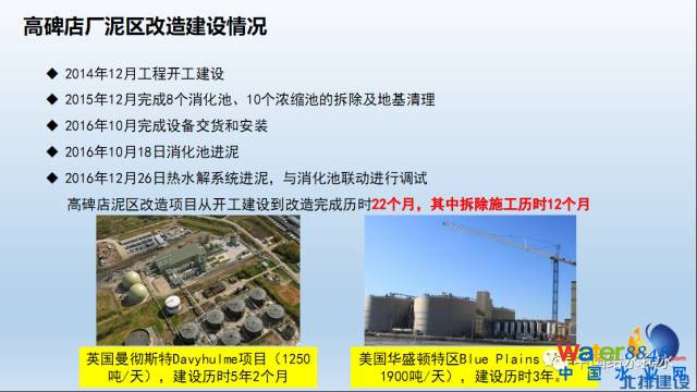 整個(gè)高碑店污泥處置中心建設(shè)改造情況為:2014年12月底開始工程建設(shè);2015年12月完成8個(gè)消化池、10個(gè)濃縮池的拆除及地基清理工作;2016年10月完成設(shè)備交貨和安裝;2016年10月18日消化池進(jìn)泥,2016年12月26日熱水解系統(tǒng)進(jìn)泥,與消化池聯(lián)動(dòng)進(jìn)行調(diào)試。高碑店泥區(qū)改造項(xiàng)目從開工建設(shè)到改造完成歷時(shí)22個(gè)月,其中拆除施工歷時(shí)12個(gè)月,相比國(guó)外同等建設(shè)規(guī)模、體量相近的英國(guó)曼徹斯特的項(xiàng)目、美國(guó)華盛頓特區(qū)Blue Plains 項(xiàng)目,我們大大縮短項(xiàng)目工程建設(shè)周期。