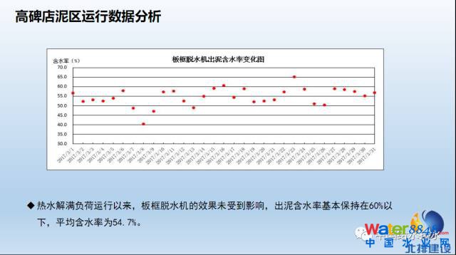 在調(diào)試過程中,通過對(duì)消化池溫度、PH值、VFA/TAC、氨氮和游離氨等數(shù)據(jù)的監(jiān)測(cè)和控制,保證了消化池在負(fù)荷提高時(shí)的穩(wěn)定運(yùn)行,同時(shí)平穩(wěn)度過微生物的轉(zhuǎn)換期,成功完成整個(gè)系統(tǒng)的啟動(dòng)。隨著熱水解滿負(fù)荷運(yùn)行以來,板框脫水機(jī)的效果未受到影響,出泥含水率基本保持在60%以下,平均含水率為54.7%。