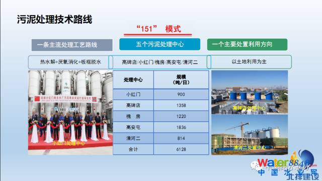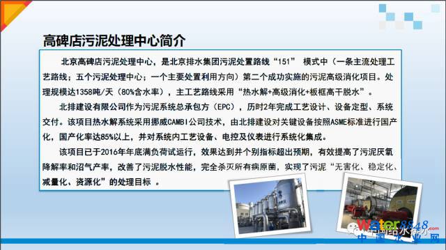 結(jié)合以上幾點(diǎn),我們以消化為基本,考慮到系統(tǒng)的能耗、生物固體品質(zhì)、衛(wèi)生學(xué)要求,依據(jù)現(xiàn)有污泥設(shè)備設(shè)施,系統(tǒng)集成商特點(diǎn)和經(jīng)驗(yàn)確定了污泥處理處置的技術(shù)路線。即形成“熱水解+高級(jí)厭氧消化+板框脫水+土地利用”污泥處理處置技術(shù)路線,從而使污泥處置達(dá)到無害化、穩(wěn)定化、減量化、資源化、低碳化處理目標(biāo)。建立了一條以“熱水解+厭氧消化+板框脫水”一條主流處理工藝路線,建立了一個(gè)151模式。下面我重點(diǎn)介紹一下高碑店污泥處理中心的情況。高碑店污泥處理中心是151模式中第二個(gè)處理的消化項(xiàng)目,處理規(guī)模達(dá)到1358噸每天,北排建設(shè)有限公司作為污泥項(xiàng)目系統(tǒng)的總承包方,歷時(shí)兩年完成工藝設(shè)計(jì)、設(shè)備定型,系統(tǒng)交付。目前高碑店項(xiàng)目在2016年年底已達(dá)到滿負(fù)荷試運(yùn)行,效果非常顯著,有效提高了污泥厭氧降解率和沼氣的產(chǎn)氣量,改善了污泥的脫水性能。