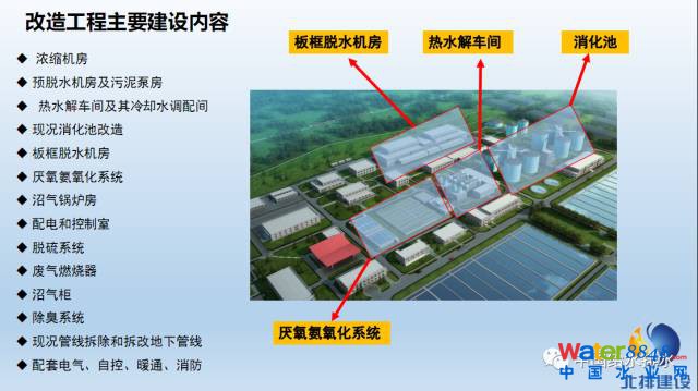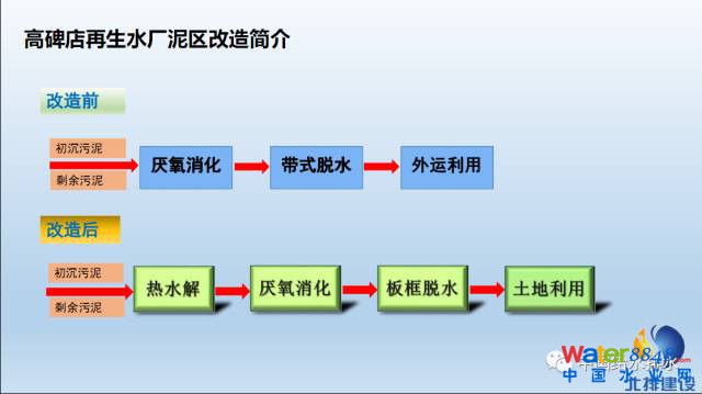 關(guān)于改造前和改造后的高碑店污泥處置中心的工藝路線,主要就是新增了熱水解單元,對(duì)原有的消化池進(jìn)行了改造,新增板框脫水機(jī)房,同時(shí)板框?yàn)V液采用了北排研發(fā)的紅菌技術(shù),這是整個(gè)改造工程的主要的建設(shè)內(nèi)容。