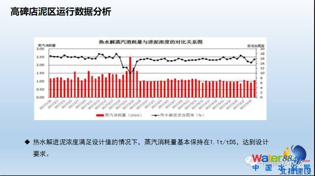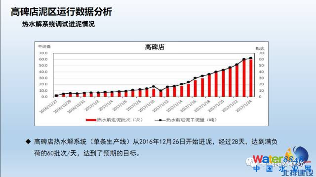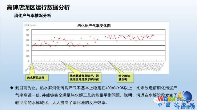 下面介紹一下具體的調(diào)試情況。高碑店熱水解系統(tǒng)(單條生產(chǎn)線)從2016年12月26日開始進(jìn)泥,經(jīng)過28天,達(dá)到滿負(fù)荷的60批次/天,達(dá)到了預(yù)期的目標(biāo)。同時(shí),在熱水解進(jìn)泥濃度滿足設(shè)計(jì)值的情況下,蒸汽消耗量基本保持在1.1t/tDS,達(dá)到設(shè)計(jì)要求;到目前為止,熱水解消化污泥產(chǎn)氣率基本上穩(wěn)定在400m3/tDS以上,比未改造前消化污泥產(chǎn)氣率高近一倍,并能夠完全滿足熱水解工藝的能量平衡問題。說明,污泥在水解階段發(fā)生了較徹底的水解酸化,大大提高了消化池的反應(yīng)效率。在圖表中我們可以看到隨著熱水解的啟動(dòng),產(chǎn)氣率逐漸從不到三百慢慢提升,一直穩(wěn)定在400左右,甚至高的時(shí)候可以接近500。