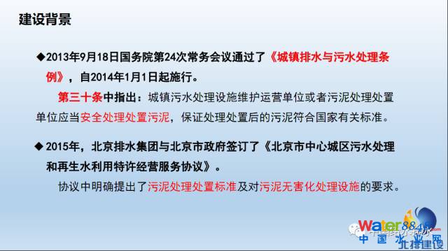 田宇:各位領(lǐng)導(dǎo),各位專家,各位同仁大家上午好,由我代表北排建設(shè)公司向各位匯報(bào)一下高碑店污泥高級(jí)厭氧消化建設(shè)與運(yùn)行的實(shí)例分析。匯報(bào)分為三個(gè)部分,第一部分為項(xiàng)目介紹。建設(shè)背景是因?yàn)楸本┏菂^(qū)污水處理廠改造三年行動(dòng)方案實(shí)施后,將有12座再生水廠,總處理規(guī)模將達(dá)到413萬立方米每天,其中新增150萬立方米每天,同時(shí)改建和新建5座污泥處理中心,總的污泥處理規(guī)模達(dá)到了6128噸每天。污泥處理的產(chǎn)量將是原來的一倍以上。從政策背景方面來講,2013年開始,國(guó)務(wù)院通過了城鎮(zhèn)排水與污水處理?xiàng)l例,在條例中指出,城鎮(zhèn)污水處理設(shè)施運(yùn)營(yíng)維護(hù)單位或者污泥處理處置單位應(yīng)當(dāng)安全處理處置污泥,保證處理處置后的污泥符合國(guó)家相關(guān)標(biāo)準(zhǔn)。同時(shí),2015年,北排集團(tuán)與北京市政府簽訂了特許服務(wù)經(jīng)營(yíng)協(xié)議,在協(xié)議中明確地提出污泥處理處置的標(biāo)準(zhǔn)及對(duì)污泥無害化處理設(shè)施的要求。