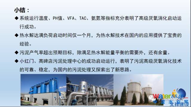 第三部分是我們的建設(shè)心得。我們北排建設(shè)與PURAC(普拉克)公司、CAMBI(康碧)公司簽署合作協(xié)議,成立BPC聯(lián)合體,引進(jìn)國(guó)際先進(jìn)技術(shù)實(shí)現(xiàn)三方合作共贏。同時(shí)在工程建設(shè)中,我們采用EPC工程模式,建立了技術(shù)標(biāo)準(zhǔn),培養(yǎng)了核心團(tuán)隊(duì),獲得了核心競(jìng)爭(zhēng)力,從而確定市場(chǎng)地位,更好的為客戶提供了全流程的服務(wù)。啟動(dòng)運(yùn)行,表明了污泥高級(jí)厭氧消化技術(shù)的可靠、穩(wěn)定,為國(guó)內(nèi)的污泥處理又探索出了新思路。
