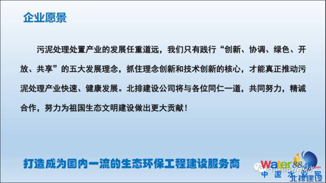 最后,污泥處理處置產(chǎn)業(yè)的發(fā)展任重道遠(yuǎn),我們只有踐行“創(chuàng)新、協(xié)調(diào)、綠色、開放、共享”的五大發(fā)展理念,抓住理念創(chuàng)新和技術(shù)創(chuàng)新的核心,才能真正推動(dòng)污泥處理產(chǎn)業(yè)快速、健康發(fā)展。北排建設(shè)公司將與各位同仁一道,共同努力,精誠(chéng)合作,努力為祖國(guó)生態(tài)文明建設(shè)作出更大貢獻(xiàn)!