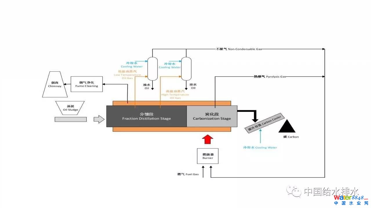 此外,我們解決了油泥處置容易結焦、連續(xù)化、資源化處置的問題。我們設備段前是分餾段,餾分段利用不同的沸點把油提取出來,炭化段熱解氣作為油泥炭化的熱源。