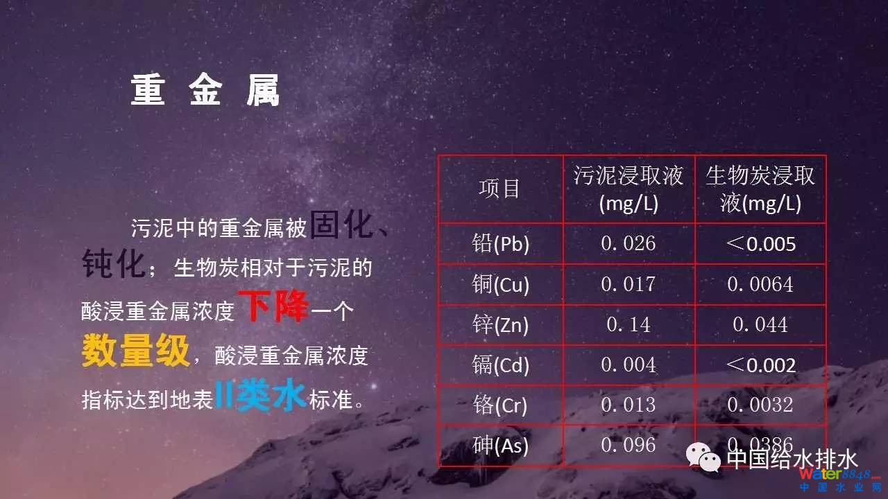 污泥炭化系統(tǒng)尾氣我們做了一級噴淋除塵,二氧化硫檢測值在二點幾,氮氧化物檢測值在十幾,各項指標遠低于國家排放標準;如果加一級電除塵,我們的煙塵顆粒物可以控制在10毫克,達到超凈排放標準。大家還可以看重金屬檢測指標,大家對污泥中的重金屬都很重視,污泥通過熱解處理后重金屬浸取濃度指標下降一個數(shù)量級,生物炭酸浸水的重金屬濃度可以達到一類水的標準,個別指標二類水的標準。說明重金屬被鈍化、固化了,非常安全。