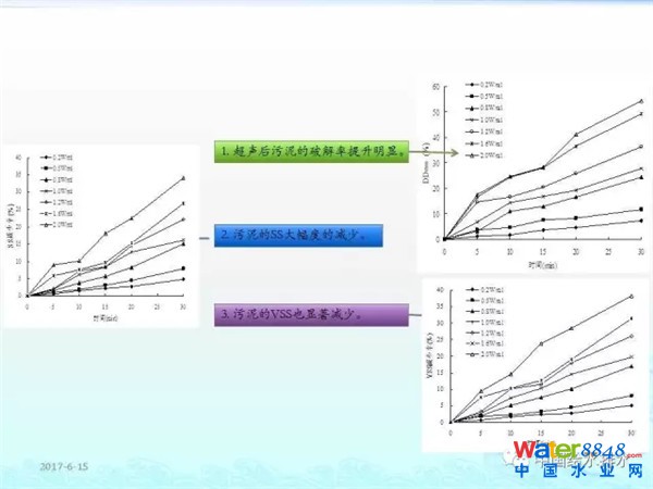 (詳見(jiàn)PPT) 這樣一個(gè)溶胞過(guò)程受很多因素影響,首先是污泥本身的特性,總固含量是多少,VSS的含量是多少,超聲的時(shí)間、超聲的強(qiáng)度等等都會(huì)影響到這樣一個(gè)超聲溶胞的效率。