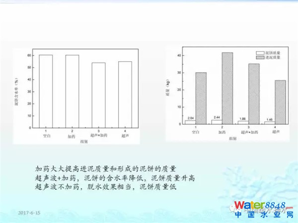 接下來(lái)分析了泥餅的形成,就發(fā)現(xiàn)超聲波加藥,泥餅的含水率可以進(jìn)一步的降低。但是里面的干重就會(huì)增加,如果超聲波不加藥出來(lái)跟只加藥不加超聲是一樣的效果。