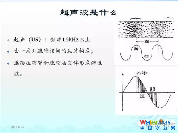 說(shuō)的半天超聲波能干這個(gè)、能干那個(gè),我們來(lái)看一下超聲波是怎么回事?從定義來(lái)看,就是功率超過(guò)16kHz咱們的耳朵聽(tīng)不見(jiàn),超聲波是一個(gè)縱波,它的傳遞就是在水里或者是污泥里面是這樣一個(gè)傳遞的方式,我們所利用的是功率超聲。超聲波有兩種,一種叫做檢測(cè)超聲,比如說(shuō)家里女同志懷孕去做B超,那叫檢測(cè)超聲。我們用的是功率超聲。功率超聲顧名思義就是它的功率比較大,在水中就可以帶來(lái)一系列的作用。首先是一個(gè)直接強(qiáng)化傳質(zhì),因?yàn)樗焖賶、張?6千赫茲,也就是每秒鐘有1.6萬(wàn)次,帶來(lái)一個(gè)非常大的加速度。在功率達(dá)到一定的功率之后,就會(huì)產(chǎn)生一個(gè)空化這樣一個(gè)現(xiàn)象,我們就叫做超聲空化現(xiàn)象。這個(gè)現(xiàn)象非常常見(jiàn),空化泡瞬間破裂,會(huì)帶來(lái)一個(gè)強(qiáng)烈的沖擊波。這個(gè)沖擊波和空化現(xiàn)象就可以用污泥的絮體打破,也就是后面說(shuō)的一系列它在污泥里面應(yīng)用的基礎(chǔ),就來(lái)自這樣一個(gè)工作原理。