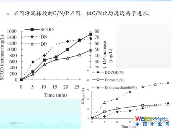 為什么要進(jìn)行選擇性破解?因?yàn)槲覀冊(cè)诔暡ㄎ勰嗥茐牡臅r(shí)候,里面的碳、氮、磷都要往外釋放,如果控制好它的條件,它不是成比例釋放,釋放的碳遠(yuǎn)遠(yuǎn)高于氮和磷的釋放。(詳見(jiàn)PPT)這時(shí)候可以看一下氮釋放出來(lái)、磷釋放出來(lái)的,大概是幾百到幾十。這是COD是在幾千。所以釋放出來(lái)的碳氮磷比例就非常高,這個(gè)就可以作為碳源使用。如果控制不好,碳氮磷同步釋放出來(lái),回到水里去也一樣要脫氮除磷,就沒(méi)有意義了。