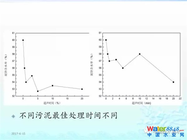 接下來(lái)匯報(bào)一下強(qiáng)化污泥脫水,就是減容的效果,這是非常大家熟悉的,就是剩余污泥,已經(jīng)出來(lái)的泥,機(jī)械脫水之前加了一個(gè)超聲調(diào)理的過(guò)程,所以大家注意我們這里的目的是超聲調(diào)理,而不是溶胞。這個(gè)地方要溶胞就麻煩了,如果還是溶胞它的脫水性能是惡化的。這個(gè)地方要做到的是調(diào)理。調(diào)理的時(shí)候,實(shí)際上就是對(duì)污泥里面的水分分布進(jìn)行一個(gè)改動(dòng)。