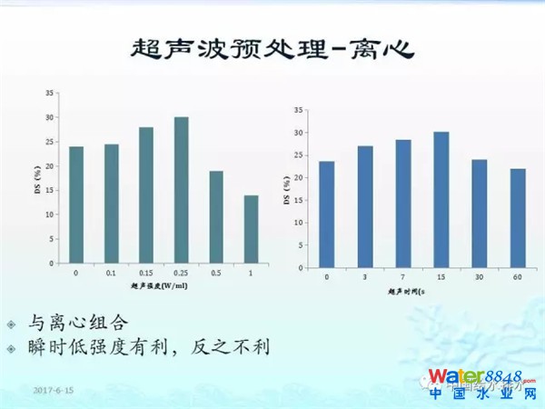 (詳見(jiàn)PPT)我們用了兩個(gè)設(shè)備,一個(gè)是離心機(jī),一個(gè)隔膜式的板框壓濾。首先看一下超聲波-離心的組合,我們可以看到瞬時(shí)低強(qiáng)度對(duì)脫水是有利的,如果時(shí)間長(zhǎng)了反而會(huì)惡化。剛才已經(jīng)說(shuō)過(guò)。
