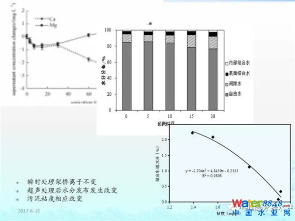 (詳見(jiàn)PPT)這幾張圖比較清楚,這個(gè)部分超聲波調(diào)理的要素就是低強(qiáng)度、損蝕,如果強(qiáng)度高、時(shí)間長(zhǎng)絮體反而會(huì)再次分散,吸附水會(huì)再度上升,脫水反而會(huì)惡化。我們損蝕的時(shí)候可以看到絮體會(huì)更加緊密,絮體緊密之后就把毛細(xì)水?dāng)D出來(lái),就成功實(shí)現(xiàn)了我們對(duì)毛細(xì)水調(diào)理的一個(gè)過(guò)程。我們測(cè)了一些微觀指標(biāo),架橋例子、分布和粘度的變化。剛才已經(jīng)講了對(duì)毛細(xì)水有一個(gè)改變,對(duì)污泥的黏度會(huì)有一個(gè)改變。