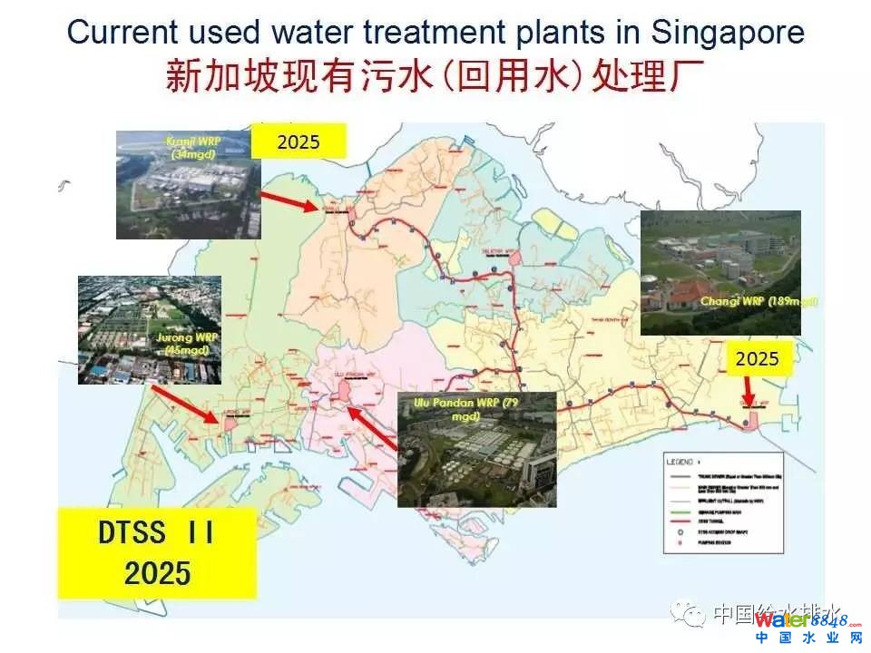 (詳見(jiàn)PPT)新加坡現(xiàn)有4個(gè)污水處理廠,總處理量是160萬(wàn)噸。三個(gè)紅塊稱之為第二階段的污水處理廠。這兩個(gè)現(xiàn)有污水處理廠在新廠建成以后就要廢除了,到2025年新加坡會(huì)就有三個(gè)污水處理廠,總處理量到時(shí)候是240萬(wàn)立方米/天。