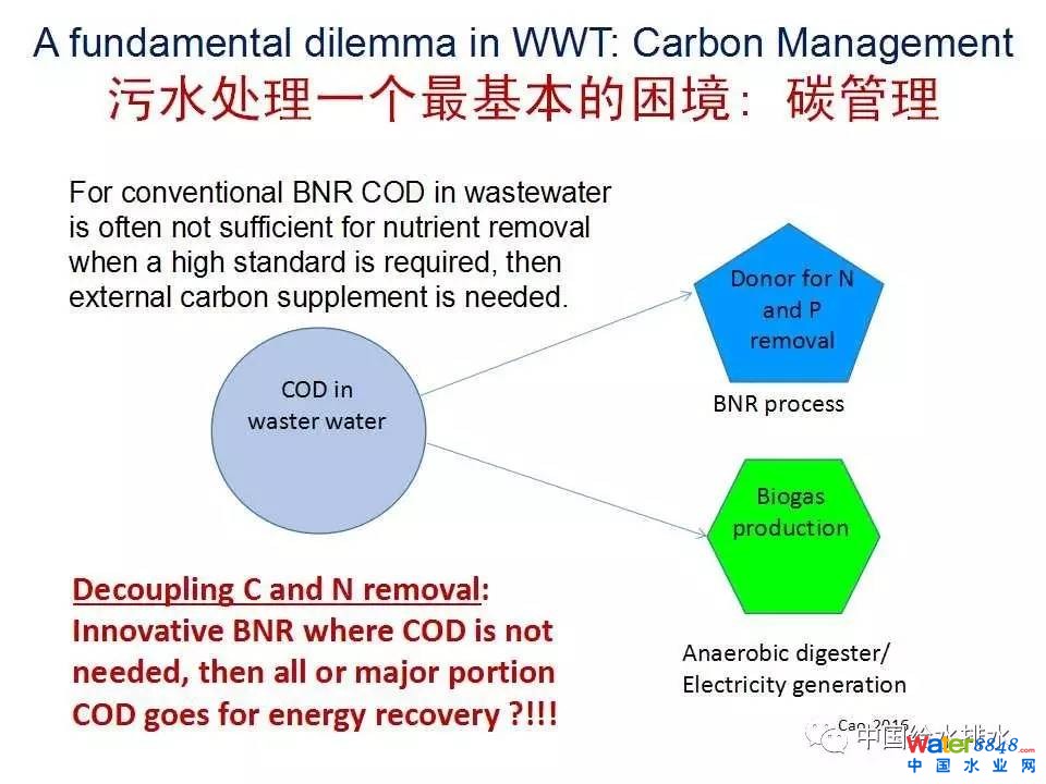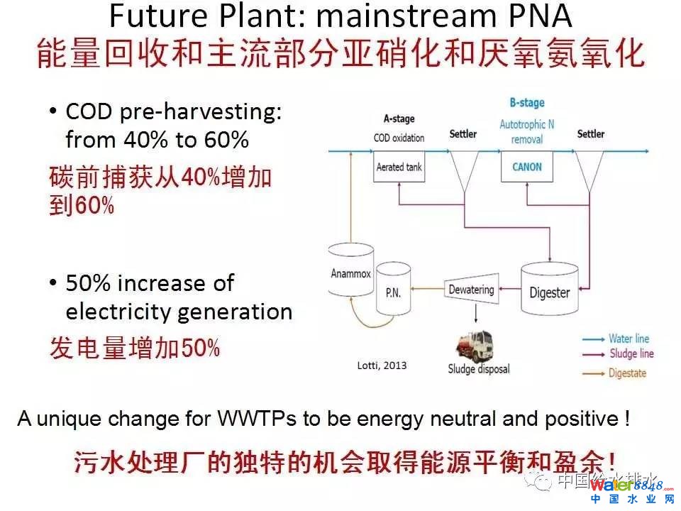 到2025年新加坡三個(gè)水廠建成的時(shí)候,能量回收的情況如何呢?污水處理最大的困境就是碳的管理,本身讓碳源要用來(lái)去除營(yíng)養(yǎng)物又產(chǎn)能源的時(shí)候,是很難兩全其美的,這就是我們現(xiàn)在要談主流厭氧氨氧化的問(wèn)題。未來(lái)處理廠的概念,如果這概念廠能實(shí)現(xiàn),今后的處理廠可可以把盡量多的碳拿下來(lái)送到厭氧消化里面去產(chǎn)生能源。但是條件是什么呢?后面的營(yíng)養(yǎng)物的去除不需要碳源,或者是需要的很少,這就提供了一種能源平衡和剩余的可能性。比如說(shuō)我們先的現(xiàn)在的初沉池碳去除是40%,你就可以增長(zhǎng)到60%,相當(dāng)于50%能源的增加。