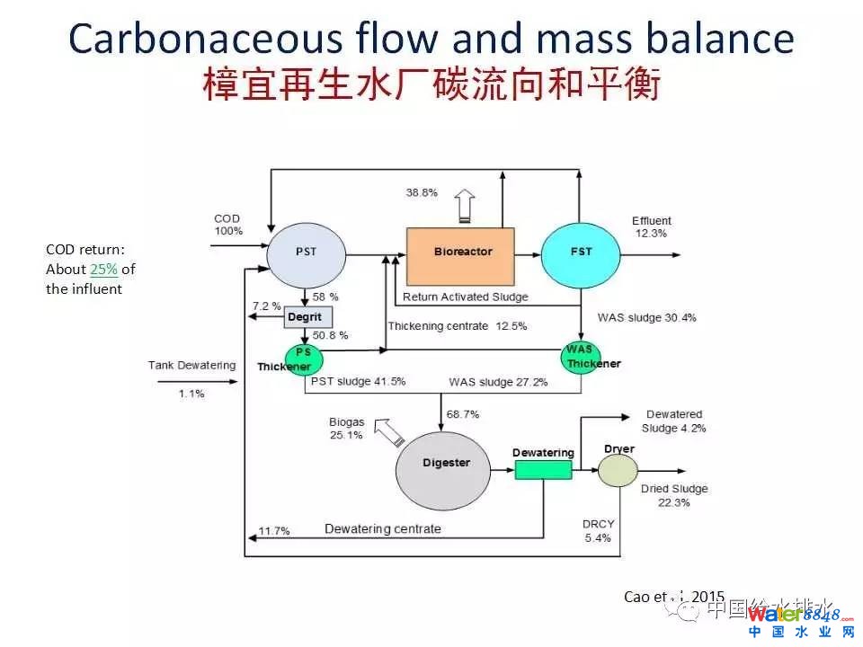 這張圖是整個(gè)廠里面碳的流向,你可以看到每一個(gè)過(guò)程碳的分布,而重要的是有多少碳進(jìn)入了厭氧消化池,而產(chǎn)生的多少甲烷氣。