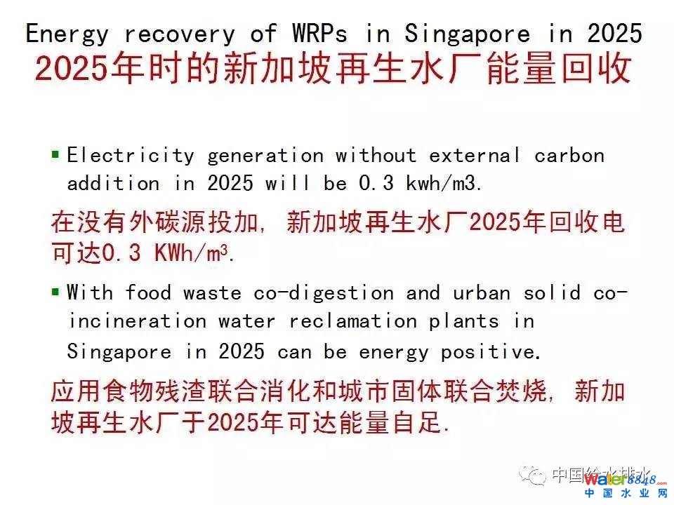 到2025年的時(shí)候,新加坡再生水廠的能源回收在沒(méi)有外加碳源的情況下可以達(dá)到0.3千瓦時(shí)每立方米污水。應(yīng)用食物殘?jiān)统鞘泄腆w廢棄物的協(xié)同焚燒,整個(gè)新加坡污水處理廠包括新生水廠可以達(dá)到能源自給,從而實(shí)現(xiàn)新加坡污水能源回收的第三版。