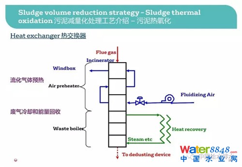 污泥焚燒后煙氣進(jìn)入的下一設(shè)備是煙氣換熱器。換熱器實現(xiàn)兩個功能:第一個功能是給流化空氣預(yù)熱;另一個功能是回收煙氣中的熱量,提高系統(tǒng)的熱效率。若焚燒之前有干化工藝存在,那么這部分回收的熱量可以轉(zhuǎn)換成飽和蒸汽,供給干化機(jī)使用。