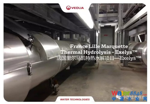 這是我公司在法國里爾馬凱特污水處理廠采用的連續(xù)式熱水解的現(xiàn)場照片。這個項目的日處理能力是60噸干泥。熱水解采用12米長的管式反應(yīng)器,外殼包有保溫層。這座污水處理廠環(huán)河而建,威立雅為其進(jìn)行了水廠處理工藝的升級改造,采用了緊湊型工藝,增設(shè)了三級處理工藝。泥區(qū)主要采用熱水解+消化+干化的處理工藝。
