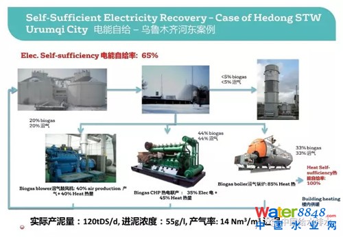 這座污水處理廠每天共產(chǎn)生約120噸干泥。實際沼氣產(chǎn)量為32400Nm3/d(該廠現(xiàn)階段未滿負(fù)荷運行)。產(chǎn)生的沼氣約有 40%進(jìn)行熱電聯(lián)產(chǎn),20%拖動沼氣鼓風(fēng)機(jī),30%用于沼氣鍋爐。最終,該廠實現(xiàn)了熱能的100%回用,電能自給率65%。