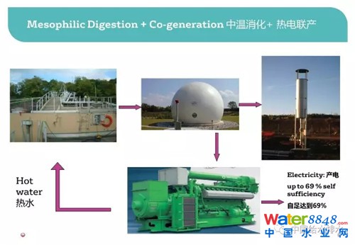 這是威立雅在南布達(dá)佩斯污水廠的聯(lián)合厭氧消化的業(yè)績。增加聯(lián)合厭氧消化之后,沼氣產(chǎn)量提高了4倍,熱電聯(lián)產(chǎn)產(chǎn)電提高的3倍,能源自給率達(dá)到80%。