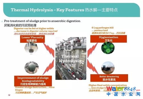 第二種基于消化應(yīng)運而生的污泥處理技術(shù)是污泥熱水解技術(shù)。它一般是作為消化的一種預(yù)處理工藝出現(xiàn)的。熱水解就是利用高溫高壓蒸汽,實現(xiàn)對污泥蒸和煮的過程。在這個過程中,污泥細(xì)胞破壁,胞內(nèi)物質(zhì)溶出,成為了可以利用的一部分基質(zhì)。這樣一來,沼氣產(chǎn)量得到了提高;污泥粘度降低,使得消化池可以接收含固率更高的污泥;對污泥進(jìn)行高溫蒸煮也是一個細(xì)菌滅活的過程,因此污泥的衛(wèi)生學(xué)指標(biāo)也將得到改善;最后,消化后脫水工藝可以實現(xiàn)更高的污泥含固率;減少后續(xù)處理或處置的設(shè)備或污泥體積。
