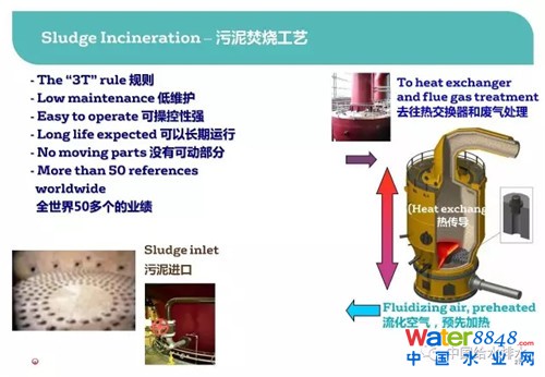 第二類在這里想和大家分享的污泥處理技術(shù)是污泥焚燒。威立雅的污泥焚燒技術(shù)主體工藝采用的是鼓泡式流化床焚燒爐。它是由風(fēng)室、拱頂、砂床、燃燒室、爐頂和煙道組成。污泥在爐內(nèi)燃燒,遵循“3T”規(guī)則,煙氣經(jīng)過換熱和煙氣處理工段,最后處理后的潔凈煙氣達(dá)到歐盟2000標(biāo)準(zhǔn)排放。由于焚燒爐是用耐火磚砌筑而成,內(nèi)部沒有移動部件,所以運行穩(wěn)定,維護(hù)費用低。