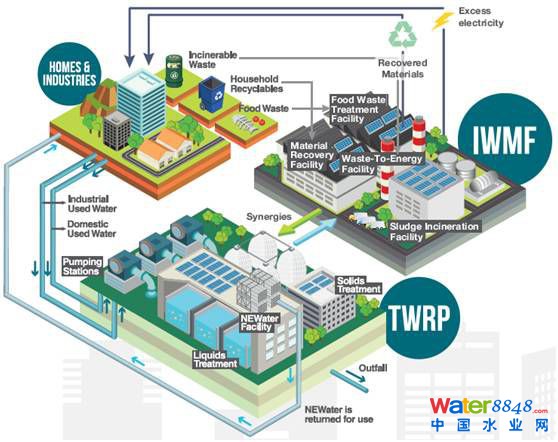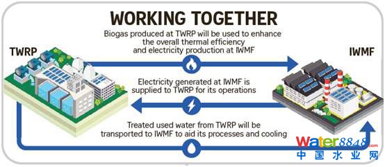 新加坡的水務機構PUB和國家環(huán)境局NEA合作推出一項頗具環(huán)境創(chuàng)造力的環(huán)保工程規(guī)劃,使再生水廠(Tuas Water Reclamation Plant –TWRP)和垃圾處理廠(Integrated Waste Management Facility -IWMF)協同合作,實現水-能源-廢棄物的循環(huán)。IWMF和TWRP將在各自的固體廢棄物處理和污水處理過程中最大限度地實現能源和資源回收。