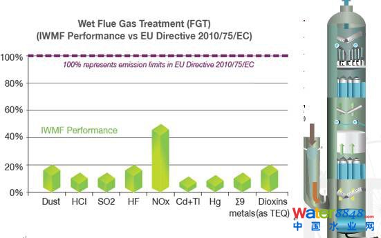 IWMF設計有先進的濕煙氣處理(FGT)系統,洗滌塔(高度≈30米),酸性氣體在濕式洗滌器中被中和,飛灰在上游被捕獲,以確保最清潔的空氣排放。跟歐盟工業(yè)排放指令EU Directive 2010/75/EC 的指標要求對照來看,空氣污染物排放優(yōu)勢非常明顯。