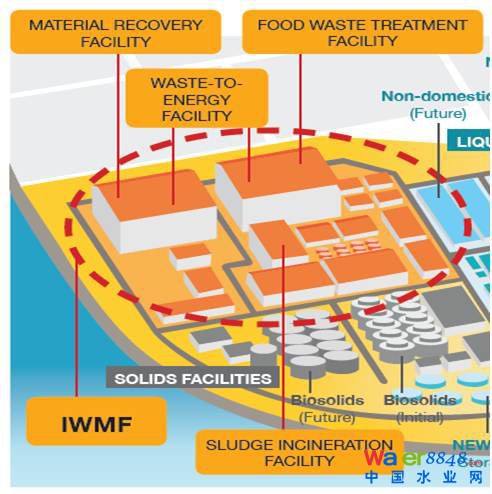 IWMF的初步布局及其各種處理設施如圖所示,包括物料回收設施,廢棄物-能源設施,廚余垃圾處理設施,污泥焚燒設施等。IWMF與TWRP共同位于Tuas View,占地68公頃。