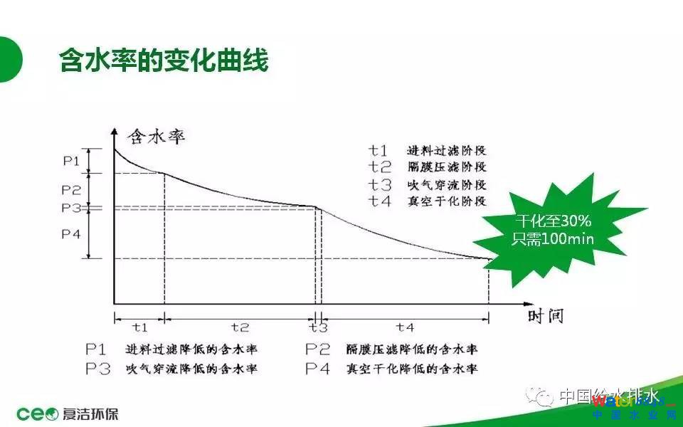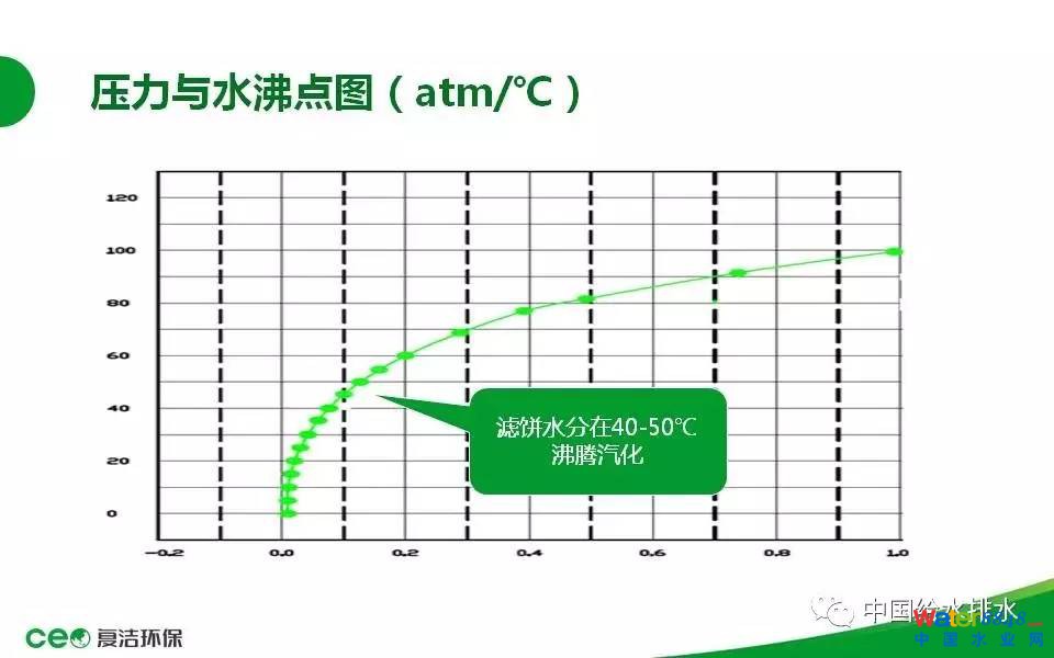 低溫真空脫水干化成套技術(shù)主要是針對含固率比較高的或者含水率比較低的物料的固液分離,實現(xiàn)脫水干化一體化,減少了污泥在脫水和干化這兩個工藝之間的一些轉(zhuǎn)換,包括一個時間的轉(zhuǎn)換,包括空間的轉(zhuǎn)換,在這個轉(zhuǎn)換過程中,也會降低對環(huán)保上,包括安全上的一些壓力。采用機械脫水以后,機械脫水有一個極限,脫到含水率80、70、60,機械脫水無法再降低,我們再用低溫真空干化的原理,使污泥達到傳統(tǒng)熱力干化的脫水效果。可以實現(xiàn)污泥處理含水率10-60%可調(diào)。這是一個壓力和水沸點的曲線。右側(cè)是一個標(biāo)準(zhǔn)大氣壓下水的沸點是一百度,我們的低溫真空的概念,通過抽真空使泥餅中的水分在40-50度時沸騰汽化。這是整個工藝流程的四個階段:進料過濾,隔膜壓濾,吹氣穿流,真空干化。