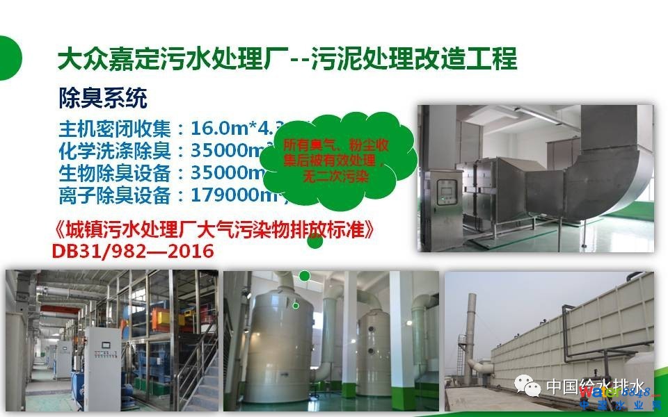 燃氣熱水鍋爐,加熱介質(zhì)90度熱水。真空脫濕系統(tǒng),配置真空泵、冷凝器、冷卻水。這個是設(shè)計院總體考慮,用園區(qū)再生水作為冷卻水。這是一個雙軸螺旋輸送機,干化后污泥含水率小于30%。除臭設(shè)備簡單說兩句,因為在上海市2016年3月份出臺了一個地標(biāo)要求,地標(biāo)要求比惡臭污染物的控制要高的多,所以配置了化學(xué)除臭,加生物除臭,這是一個收集加排放,同時又配置離子送風(fēng)設(shè)備。所有的除氣和粉塵收集,經(jīng)處理達標(biāo)后排放。