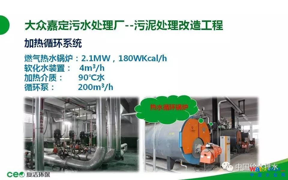 這個流程圖是典型的工藝流程圖。左側(cè)是污泥板塊,那么左上節(jié)是一個污泥濃縮設(shè)備。現(xiàn)在污水處理廠大多數(shù)都有重力氣濃縮,沒有重力濃縮的話,加一個設(shè)備,達到污泥預(yù)濃縮。右側(cè)我們在傳統(tǒng)的工藝上增加了一個熱源系統(tǒng),工藝圖中寫的是蒸汽,在項目過程中,所需要的熱源是80-90度的熱水,如果項目中有蒸汽,由蒸汽加熱熱水;如果沒有蒸汽,我們是配一些比如說電鍋爐、天然氣鍋爐,包括利用余熱蒸汽,兩三公斤低品位蒸汽,在這個過程中也可以使用。