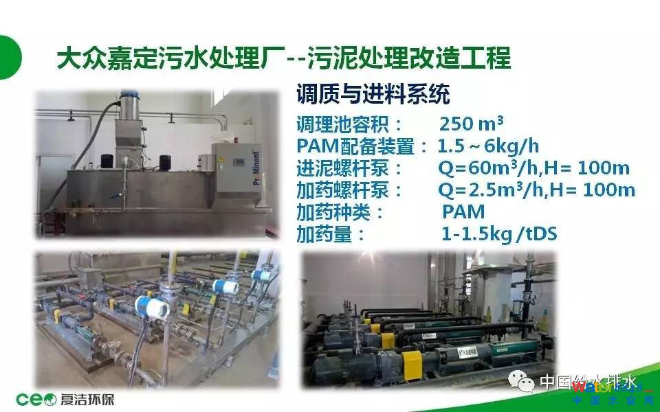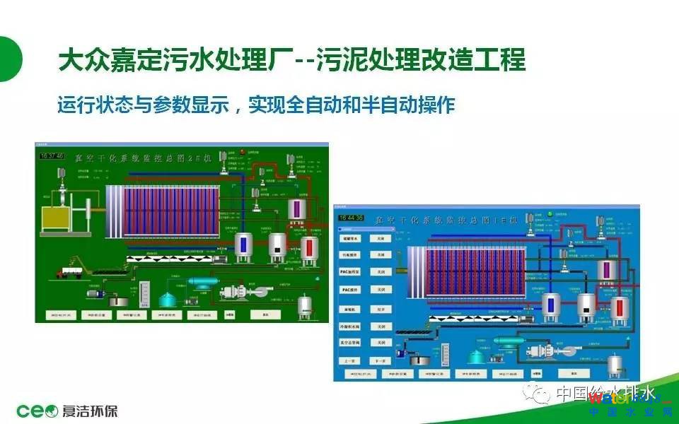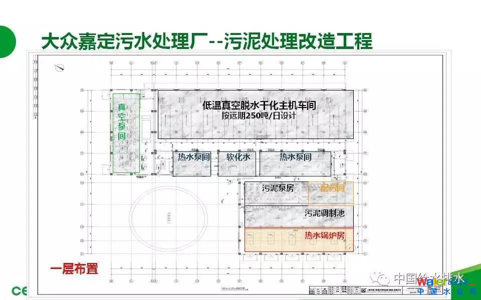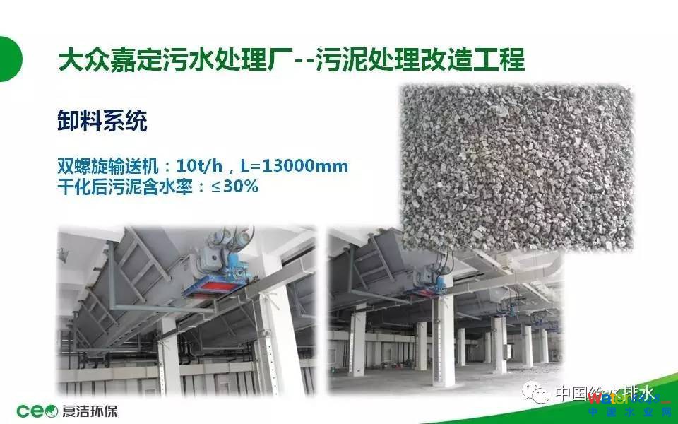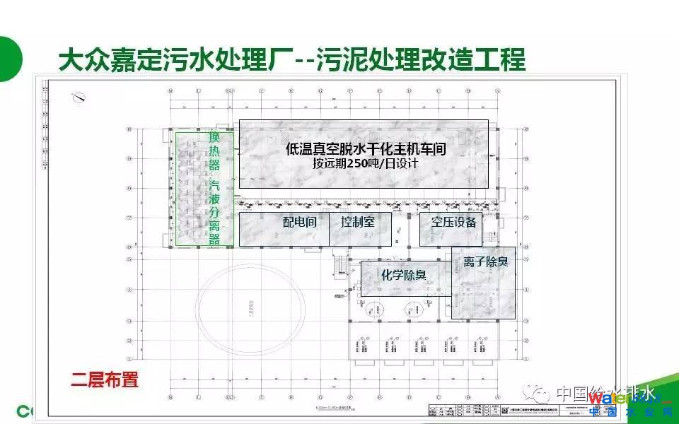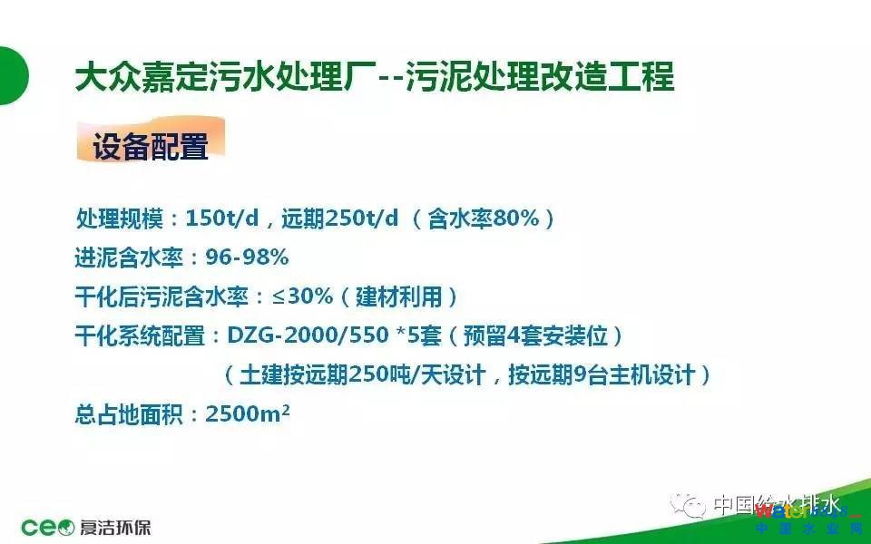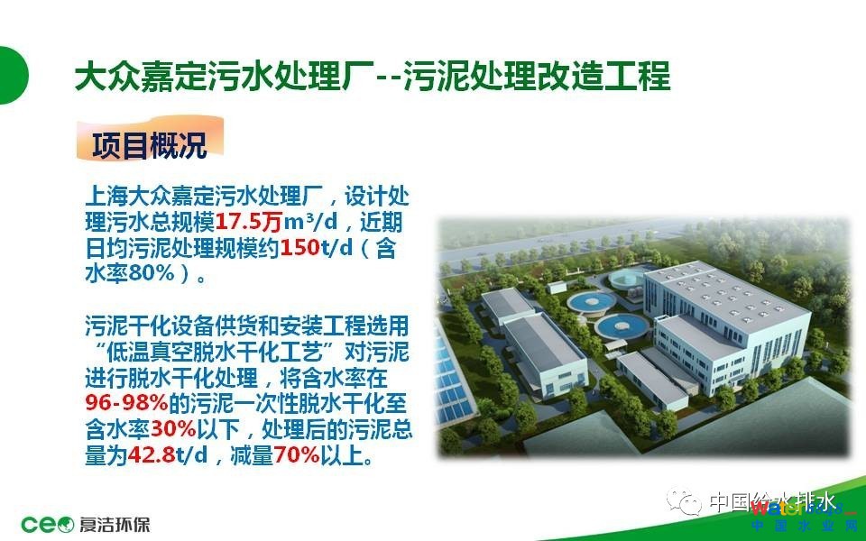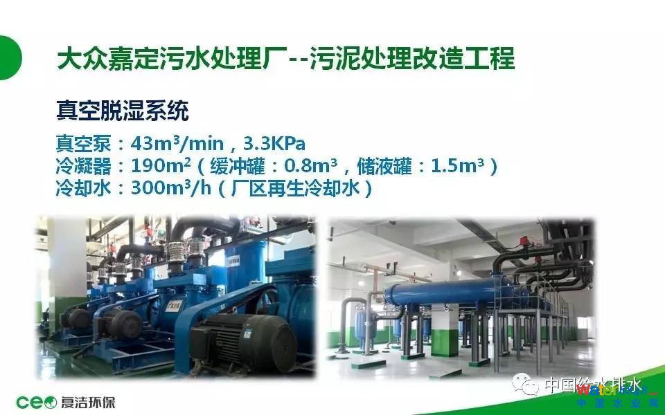 下面我介紹一個近期的工程案例。大眾嘉定污水處理廠:這是上海大眾嘉定BOT運行的污水處理廠,污水廠的設(shè)計污水處理規(guī)模是17.5萬噸,分三期建設(shè),現(xiàn)在三期已經(jīng)建設(shè)完成了。近期的污泥處理規(guī)模是150噸,就是17.5萬噸的水,150噸的泥,污泥干化設(shè)備的供貨安裝,這是一個標(biāo)段,采用低溫真空脫水干化工藝,原泥96-98%一次性脫水干化至含水率30%以下,處理以后的污泥總量理論計算是42.8噸,減量71%左右。
