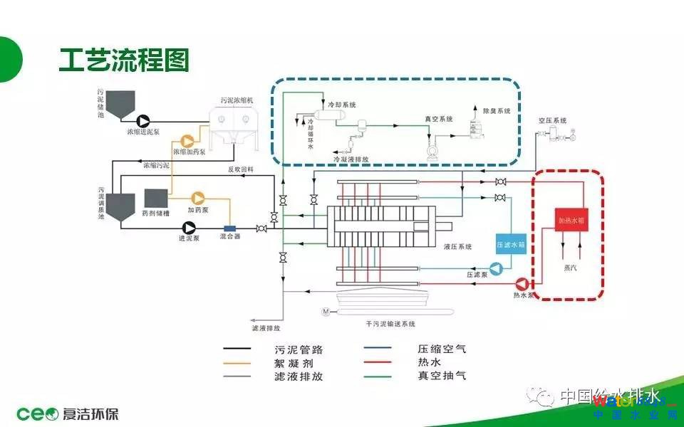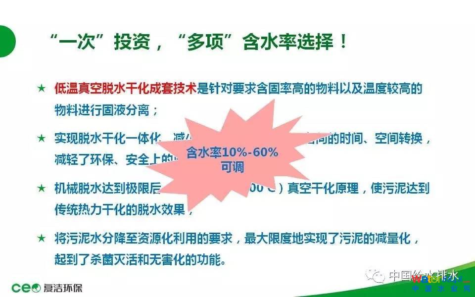 再增加一個系統(tǒng)就是真空系統(tǒng),污泥中的水分常壓下需要一百度以上才能沸騰汽化。熱源只有80度左右,所以提供一個低壓的環(huán)境,就是增加一個真空環(huán)境。這個技術(shù)集合脫水和干化一體化,從源頭進行減量,避免污泥的大量外運,包括降低了一些外運過程中的環(huán)境污染等等。那我們也是采用模塊化的設(shè)計,根據(jù)項目建設(shè)的規(guī)模包括進度,一次性設(shè)計、靈活分期建設(shè),后面有一些案例可以體現(xiàn)這一點。因為它集脫水干化為一體,直接運行成本更加低廉,;只添加少量常規(guī)的絮凝劑,藥劑成本低。熱源,我們采用熱水作為熱源,在項目建設(shè)階段,可以多途徑的去選擇熱源的組成,可以選擇低品位的余熱蒸汽,煙道氣,或者配置天然氣的鍋爐等等。