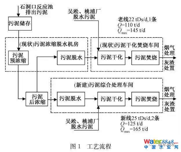 石洞口污水處理廠污泥經(jīng)機(jī)械及重力濃縮后離心脫水,脫水污泥送濕污泥料倉貯存;吳淞、桃浦兩廠的脫水污泥車運(yùn)至石洞口廠,卸至地下式接收倉后泵送至濕污泥料倉。料倉內(nèi)的脫水污泥送至干化機(jī)干化處理后,送入流化床污泥焚燒爐進(jìn)行焚燒。焚燒產(chǎn)生的熱量通過余熱鍋爐生產(chǎn)蒸汽回用于污泥干化。焚燒產(chǎn)生的煙氣經(jīng)“噴尿素(SNCR)+旋風(fēng)除塵+半干法噴淋脫硫+袋式除塵(前噴活性炭和消石灰)+濕式洗滌+煙氣再熱”處理后通過煙囪達(dá)標(biāo)排放。余熱鍋爐、旋風(fēng)除塵器和半干脫酸塔產(chǎn)生的灰渣按一般廢棄物處置,布袋除塵器截留粉塵及廢棄布袋按危險廢物處置。外加熱源是石洞口發(fā)電廠提供的廢熱蒸汽,熱媒采用蒸汽。