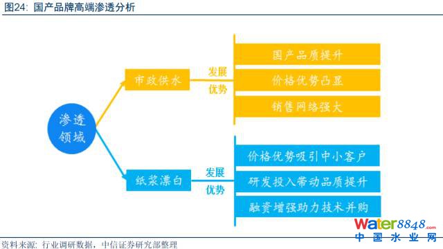 國(guó)產(chǎn)品牌進(jìn)入市政供水市場(chǎng)。供水深度處理,因?yàn)樯婕帮嬘盟踩,各地政府重視度高,通常選用穩(wěn)定性好的外資品牌產(chǎn)品。但近年來(lái),國(guó)產(chǎn)品牌也開(kāi)始滲透這一領(lǐng)域。究其原因,主要有以下幾個(gè)方面:1)國(guó)產(chǎn)品質(zhì)提升,跨越供水處理要求門(mén)檻;2)深度處理由發(fā)達(dá)地區(qū)向欠發(fā)達(dá)地區(qū)推廣,客戶價(jià)格敏感度提高;3)借助強(qiáng)大的銷(xiāo)售渠道網(wǎng)絡(luò),國(guó)產(chǎn)深度處理業(yè)績(jī)?cè)龆,為進(jìn)一步擴(kuò)張?zhí)峁╉?xiàng)目佐證。