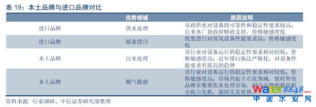 國(guó)產(chǎn)品牌揚(yáng)長(zhǎng)補(bǔ)短,替代外資加速。主要表現(xiàn)為:(1)受益于排放提標(biāo),國(guó)產(chǎn)品牌優(yōu)勢(shì)領(lǐng)域污水及煙氣處理發(fā)展迅速,持續(xù)擠壓外資空間;(2)國(guó)產(chǎn)品牌質(zhì)量提升,滲透市政供水等高端領(lǐng)域趨勢(shì)明顯;(3)近年經(jīng)濟(jì)下行,財(cái)政收入增速放緩,客觀上提升了市政水廠和紙漿廠對(duì)設(shè)備價(jià)格的敏感度。(4)市場(chǎng)總量增長(zhǎng),國(guó)產(chǎn)品牌規(guī)模效應(yīng)顯現(xiàn),成本優(yōu)勢(shì)進(jìn)一步提升。外資品牌由于全球體量大,邊際效應(yīng)較小。基于以上原因,我們認(rèn)為國(guó)產(chǎn)品牌在深耕原有領(lǐng)域的同時(shí),不斷滲透外資品牌的優(yōu)勢(shì)領(lǐng)域,替代加速。