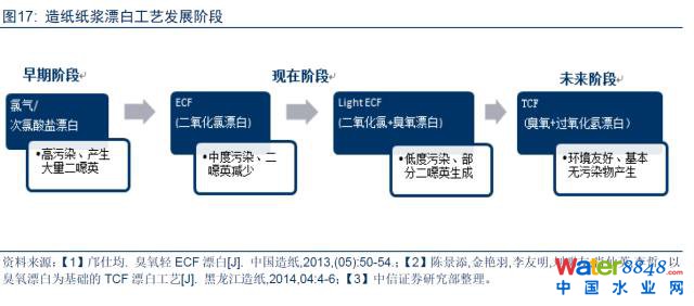 臭氧是取代含氯漂白的綠色選項(xiàng)。紙漿生產(chǎn)作為高排放、高污染行業(yè),其漂白工藝發(fā)展主要有四個(gè)階段:元素氯漂白、ECF、Light ECF、TCF。前三種工藝在漂白中都會(huì)用到氯或者氯化物,但使用的量為逐漸遞減,直到TCF全無(wú)氯漂白工藝。氯或氯化物在漂白過(guò)程中會(huì)產(chǎn)生有害污染物二噁英,對(duì)人體和環(huán)境有重大傷害。正因如此,紙漿行業(yè)源頭減排的方向是減少乃至消除漂白過(guò)程中氯的使用。