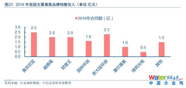 2016年市場(chǎng)規(guī)模約44億元。依據(jù)四大應(yīng)用領(lǐng)域的市場(chǎng)需求情況,我們可以加總出2016年工業(yè)級(jí)臭氧處理市場(chǎng)規(guī)模:污水處理(11.8)+供水處理(15.6)+煙氣脫硝(5.1)+ 紙漿漂白(10.2)= 43.7億元