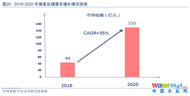 2020年預(yù)計(jì)市場(chǎng)規(guī)模近150億元,2016- 2020 CAGR 35%。依據(jù)各領(lǐng)域2020年需求產(chǎn)值預(yù)測(cè),加總可得:污水處理(30.1)+ 供水處理(39.8)+ 煙氣脫硝(14.5)+ 紙漿漂白(62.3)= 146.7億元。2016-2020四年CAGR≈35%