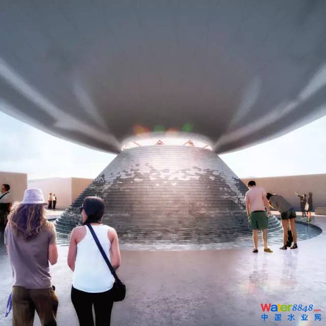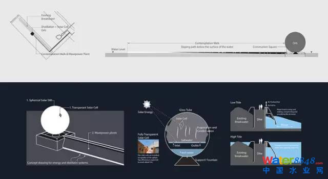 圓球的表面是由透明、發(fā)光的太陽能聚光器組成的,它提供能量給內(nèi)部的水循環(huán),圓球的內(nèi)部有一個(gè)太陽能蒸發(fā)器,它通過蒸發(fā)和冷凝作用來產(chǎn)生淡水。經(jīng)過淡化的水直接倒到底下的噴泉里,這也是對(duì)光和水對(duì)于生命意義的一次藝術(shù)性的詮釋。