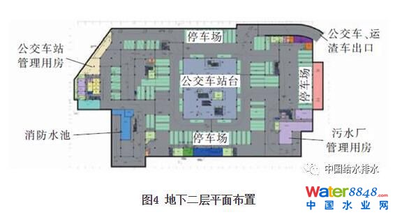 該地塊地面公園面積3.94ha,地下綜合體總建筑面積為65325.95平方米。其中地下一層為商業(yè)用房和機械停車庫,商業(yè)用房建筑面積為11201.59平方米、機械停車庫建筑面積為4397.6平方米;地下二層為公交首末站及其附屬用房,建筑面積為21320.17平方米;地下三、四層為污水處理廠,建筑面積為28406.59平方米(包括設在地下二層綜合辦公用房)。
