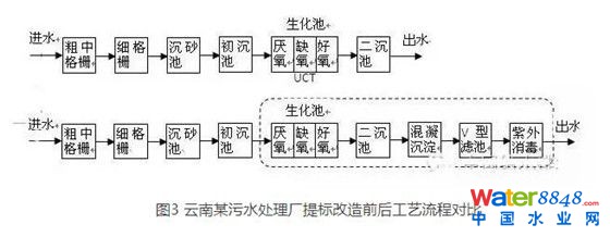 該廠改造原8.5萬m3/d,新建8.5萬m3/d,新增深度處理17萬m3/d。原工藝:UCT工藝,出水標(biāo)準(zhǔn)一級B。 改造工藝:改良A2/O+混凝沉淀過濾,出水標(biāo)準(zhǔn)一級A。改造前后工藝流程詳見圖3。
