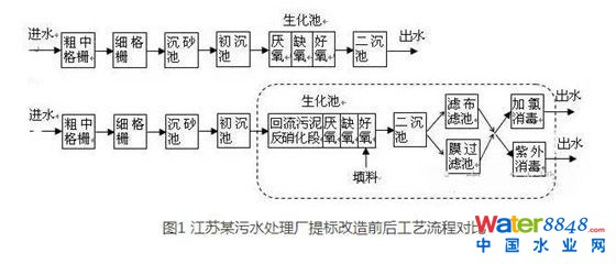 該污水廠處理規(guī)模為20萬m3/d,原工藝為A2/O,出水標(biāo)準(zhǔn)為一級B。改造工藝為改良A2/O(填料)+膜過濾或?yàn)V布濾池,出水標(biāo)準(zhǔn)為一級A。改造前后工藝流程詳見圖1。