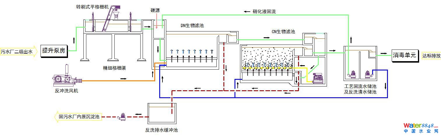 污水首先進(jìn)入微濾機(jī),將來(lái)水中的細(xì)小塊狀、顆粒狀以及纖維狀物質(zhì)過(guò)濾截流掉,保留污水中有機(jī)物、氮、磷為主的污染物質(zhì);經(jīng)過(guò)物理過(guò)濾的出水進(jìn)入缺氧反硝化生物濾池,進(jìn)行缺氧過(guò)濾,采用上向流形式,在缺氧條件下降解部分有機(jī)污染物,同時(shí)將水中的硝態(tài)氮還原成氮?dú)舛瓿擅摰^(guò)程;經(jīng)過(guò)缺氧反硝化生物濾池處理后的出水進(jìn)入好氧硝化生物濾池,進(jìn)行氧化過(guò)濾,采用上向流形式,將水中剩余的有機(jī)污染物、氨氮進(jìn)行氧化分解和轉(zhuǎn)化,有機(jī)污染物最終分解為二氧化碳和水等無(wú)機(jī)物,氨氮氧化成硝酸鹽,出水進(jìn)入清水池貯存排出,將此含有大量硝酸鹽的部分污水回流至缺氧反硝化生物濾池使其完成缺氧脫氮過(guò)濾;經(jīng)生物過(guò)濾系統(tǒng)處理后的出水再進(jìn)入化學(xué)除磷濾池,進(jìn)行除磷過(guò)濾。采用上向流形式,利用除磷陶粒濾料的溶入、釋放鈣離子作用,促使磷酸根離子與鈣離子反應(yīng),生成磷酸鈣沉淀物,達(dá)到良好的除磷效果,從而使污水得到全面凈化,最終污水經(jīng)清水區(qū)由出水渠排出,此時(shí)污水已經(jīng)達(dá)到了《城鎮(zhèn)污水廠污染物排放標(biāo)準(zhǔn)》GB18918——2002一級(jí)A標(biāo)準(zhǔn)。